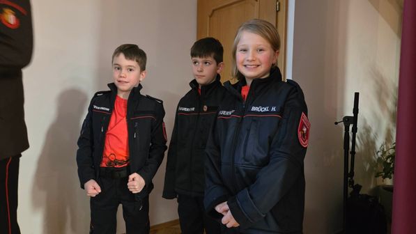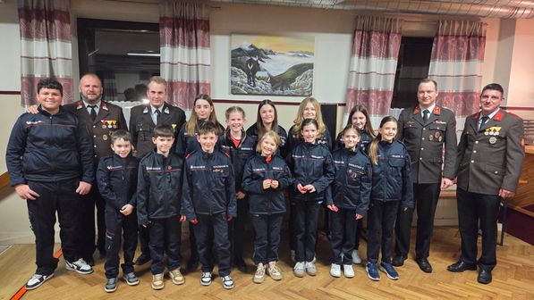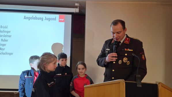 Angelobung zum Jungfeuerwehrmitglied: Hanna Brückl, Marie Bachinger, Xaver Garsleitner, Isabella Huber, Leo Kallinger, Leonie Mayr, Florian Schachinger